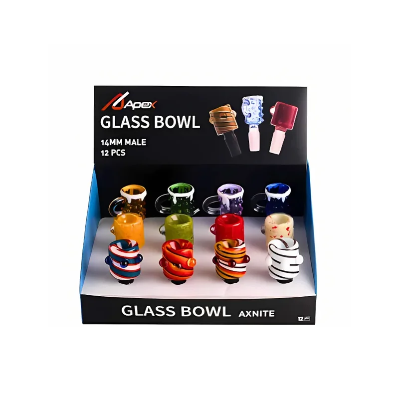 APEX GLASS BOWL AXNITE 14MM ASSORTED DESIGNS DISPLAY OF 12 (BD200) Upgrade your smoking accessories with the APEX Glass Bowl Axnite 14mm collection. Featuring a variety of stunning and unique assorted designs, these bowls are crafted from premium, durable glass to ensure long-lasting performance. Designed to fit standard 14mm water pipes, they provide a smooth and consistent smoking experience. Packaged in a convenient display of 12, these bowls are perfect for retail shelves or bulk stocking. F