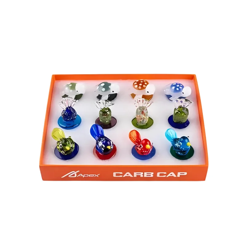 APEX PREMIUM GLASS CARB CAP ASSORTED DESIGNS DISPLAY OF 12 (CCP205) Elevate your dabbing experience with the APEX Premium Glass Carb Caps . Featuring an array of assorted unique designs , these carb caps are crafted from high-quality, heat-resistant glass to ensure durability and superior performance. Perfect for optimizing airflow control and vaporization, they are compatible with most quartz bangers and dab rigs. Packaged in a display of 12 , they make a great addition to any retail collection