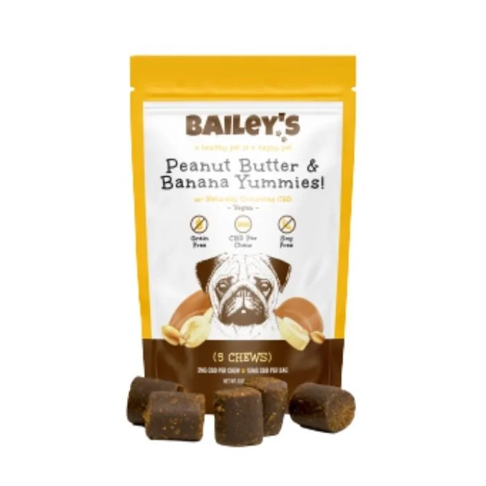 Help your pup feel relaxed, happy, and calm while enjoying a tasty treat with Bailey’s Peanut Butter & Banana Calming CBD Yummies. These soft chews combine the comforting flavors dogs love with holistic, human-grade ingredients designed to support mental balance, reduce anxiety, and promote overall calm. Each chew is formulated to target stress, hyperactivity, and behavioral issues, making it perfect for traveling, separation anxiety, bedtime, or simply maintaining a relaxed, happy dog. Key Benefits Traveling Stress Relief: Helps your dog remain calm during car rides or vet visits. Separation Anxiety Support: Reduces stress when your pup is left alone. Hyperactivity & Aggression Management: Supports a calmer, balanced temperament. Better Sleep: Encourages restfulness for pups who struggle at night. Overall Calming Support: Promotes long-term wellness and emotional balance. Available Strengths Single Pack x 5 Count x 15MG Single Pack x 30 Count x 90MG Single Pack x 30 Count x 180MG (Extra Strength) Active Ingredients & Benefits Tryptophan: Supports serotonin production, reduces aggression, and alleviates anxiety or travel stress. Chamomile (Matricaria Chamomilla): Mild sedative, anti-inflammatory, relaxes muscles, and supports gastrointestinal health. Valerian Root (Valeriana Officinalis): Helps reduce stress, anxiety, and insomnia; promotes calmness before vet visits. Passion Flower (Passiflora Incarnata): Strengthens GABA brain receptors, promotes relaxation, stabilizes serotonin and dopamine, improving mood and temperament. Naturally Occurring CBD: USDA organic full-spectrum hemp extract from Rocky Mountain sources supports anti-inflammatory effects and systemic homeostasis via the Endocannabinoid System (ECS). Inactive Ingredients Ascorbic Acid, Banana Puree, Brewers Yeast, Calcium Propionate, Chia Seed, Chickpea Flour, Coconut Oil, Glycerin, Ground Peanuts, Mixed Tocopherols, Peanut Butter, Sunflower Lecithin, Sw