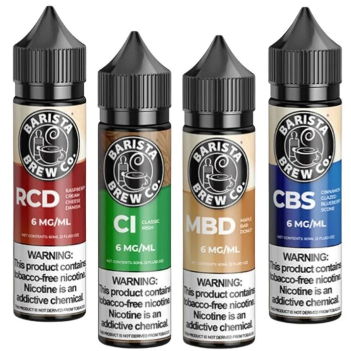 Barista Brew Co E Liquid offers a rich and smooth coffeehouse-inspired vaping experience. Available in nicotine strengths of 0mg, 3mg, and 6mg, each 60ml bottle is packed with premium ingredients for a satisfying, all-day vape. Perfect for coffee enthusiasts, these e-liquids deliver consistent, flavorful hits. Barista Brew Co E Liquid Features: Premium Ingredients: Barista Brew Co E-Liquids are crafted with the finest ingredients to provide a rich and satisfying vaping experience. Coffeehouse-Inspired Flavors: Each e-liquid is inspired by popular coffeehouse flavors, offering a unique and delightful taste perfect for coffee enthusiasts and vape lovers alike. Nicotine Options: Available in 0mg, 3mg, and 6mg nicotine strengths, catering to various preferences for a smooth vaping experience. Convenient Size: Offered in a 60ml bottle, ideal for those who enjoy larger quantities of their favorite vape juice. Meticulously Crafted: Every batch is carefully developed to ensure a high-quality, consistent flavor that elevates your vaping experience. Barista Brew Co E Liquid Flavors: Cinnamon Glazed Blueberry Scone: Enjoy the warm and comforting flavor of a freshly baked blueberry scone topped with a sweet cinnamon glaze. Classic Irish: A smooth and creamy blend inspired by traditional Irish cream, offering a rich and indulgent vape. Maple Bar Donut: Savor the taste of a delicious maple bar donut, perfectly capturing the sweet and buttery flavor. Old Fashioned Glazed Donut: A classic flavor that brings the timeless taste of an old-fashioned glazed donut to your vape. Raspberry Cream Cheese Danish: Experience the delightful combination of tangy raspberries and creamy cheese, wrapped in a flaky pastry. Smores Mocha Breeze: Indulge in the delightful taste of s'mores with a mocha twist, combining chocolate, marshmallow, and graham cracker flavors. White Chocolate Mocha: A decadent blend of smooth white chocolate and rich coffee, creating a creamy and satisfying vape.