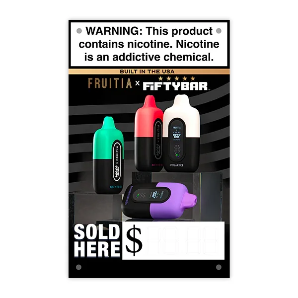 Fruitia x Fifty Bar Vinyl Banner - 15"x24" - Durable Indoor & Outdoor Marketing Display Boost your store’s visibility with this high-quality Fruitia x Fifty Bar vinyl banner . Measuring 15 inches by 24 inches , this banner is designed for maximum impact in both indoor and outdoor settings . Featuring 4 pre-installed grommet holes , it’s easy to hang in multiple locations like windows, walls, or outdoor displays. The durable vinyl material ensures long-lasting use, even in challenging weather conditions. Ideal for vape shops and retail environments . Limit of 2 banners per order . Key Features: Dimensions: 15" x 24" Durable vinyl material for indoor and outdoor use 4 grommet holes for versatile hanging options Weather-resistant design for longevity Perfect for vape stores, retail stores, smoke shops and promotional displays View more Marketing Materials for all brands here