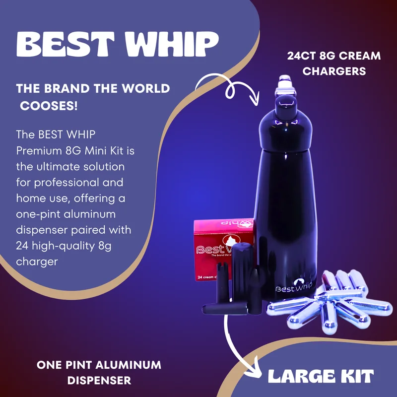 The BEST WHIP Premium N2O 8G Large Kit is a professional-grade cream whipper set , featuring a durable one-pint aluminum dispenser and 24 high-quality 8g N2O chargers . This kit is ideal for culinary professionals and home enthusiasts , delivering smooth, fluffy, and consistent whipped cream, foams, and infusions . Designed for efficiency and durability , the aluminum dispenser is lightweight yet strong , while the premium-grade chargers ensure optimal performance every time . Features: Complete
