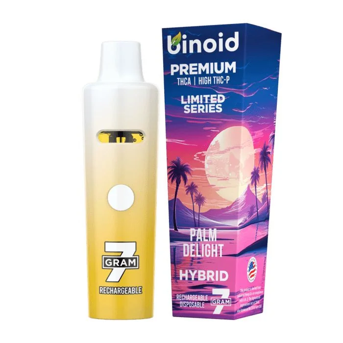 Binoid 7 Gram THCA + High THC-P Disposable Vape The strongest products we’ve ever launched. Using our popular device, the “BFV”, you’ll get a smooth and powerful smooth experience. We built this device to make clogging and leaking almost non-existent. This is the first true 7 gram disposable on the market. Part of our limited series, enjoy THCA and High THC-P paired with awesome terpenes to make an unforgettable experience. The Binoid Limited Series 7 Gram is taking the world by storm, and is getting extremely popular with these awesome live terpene flavors. Users may feel an extraordinary buzz and experience. Nobody uses High THC-P in their vapes because it’s expensive. Our customers wanted it, so we did it anyway. Enjoy! Premium Live Resin THCA and High THC-P Distillate Live Terpenes Hemp-derived Techno City (Sativa) | Palm Delight (Indica) | Snow Mountain (Indica) | Temple Kush (Hybrid)