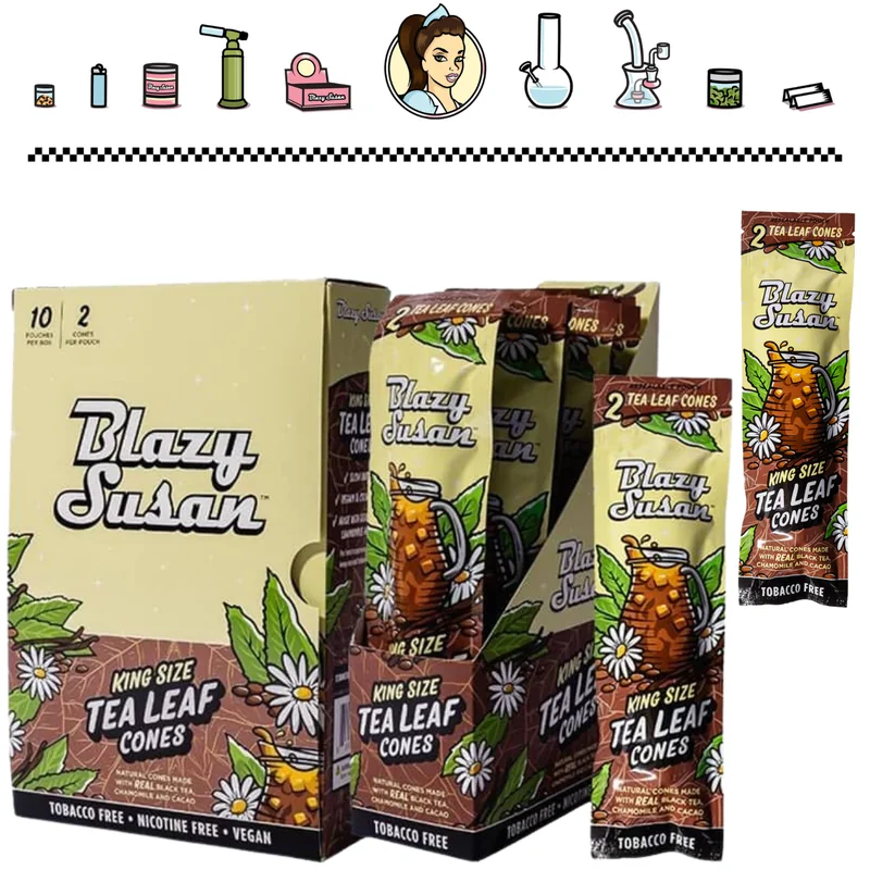 BLAZY SUSAN NATURAL TEA LEAF 2CT KING SIZE CONES DISPLAY OF 10 Elevate your smoking experience with BLAZY SUSAN NATURAL TEA LEAF 2CT KING SIZE CONES DISPLAY OF 10. These premium king-size cones are made from natural tea leaves, offering a smooth, flavorful, and eco-friendly alternative to traditional paper cones. Each pack contains 2 pre-rolled king-size cones, making it easy to fill and enjoy your favorite herbs. The display includes 10 packs, perfect for personal use, retail, or gifting. Featu