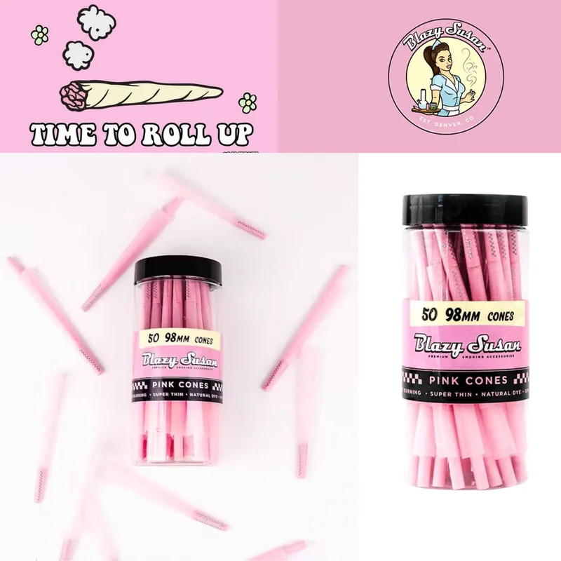 BLAZY SUSAN PINK CONES 98MM 50 CT JAR — Blazy Susan's premium cone designed for the discerning smoker. Crafted with quality materials for a clean taste and consistent burn rate. This 50 CT package offers great value for stocking retail shelves or personal use. Available at wholesale from Port City Wholesale.