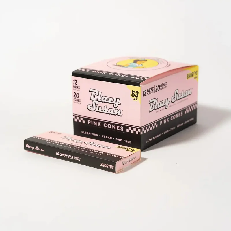 Blazy Susan Pink Pre-Rolled Cones Upgrade your inventory with Pink Pre-Rolled Cones, now available in a wholesale-ready 12-pack box, with 20 cones per pack. Crafted from ultra-thin French paper, these premium pre-rolled cones deliver a clean, smooth, and slow, even burn for a consistently satisfying experience. Made from ethically sourced, plant-based paper, these cones are 100% vegan, GMO-free, nicotine-free, and tobacco-free. The ultra-thin design enhances flavor while minimizing harshness, making them ideal for customers seeking quality and performance. Each 20-count pack comes in a compact, portable box perfect for at-home use or on-the-go convenience. The stylish pink design adds strong shelf appeal, helping your retail display stand out while offering a premium smoking accessory your customers will recognize and trust. Perfect for vape shops, smoke shops, and wholesale distributors, this 12-pack case provides reliable stock levels, eye-catching presentation, and high-quality craftsmanship in every cone. Available Sizes Shorty (53mm | ~0.5g): Great for quick sessions and personal use. 1 1/4” (84mm | ~1g): A classic size with balanced burn and capacity. 98mm (1.25–1.4g): Ideal for a longer, smoother experience. King Size (109mm | 1.6–1.8g): Perfect for extended sessions and group settings. Blazy Susan cones combine style, sustainability, and performance—an easy add-on for any rolling paper lineup.