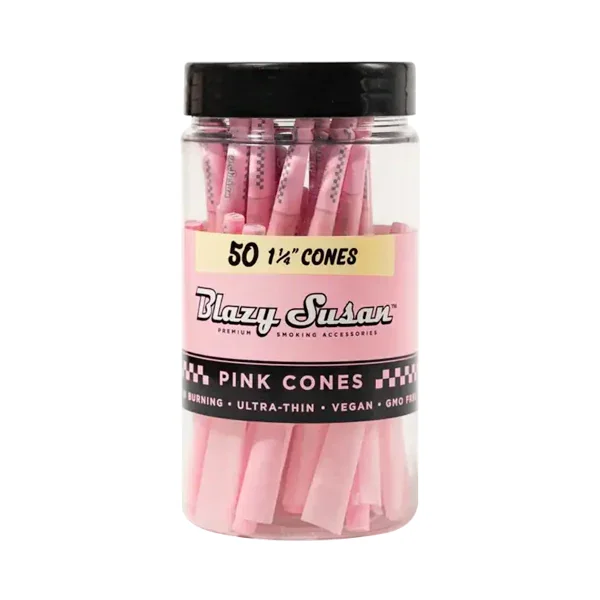 Blazy Susan 1.25" Size Cones 50ct Jar The wholesale Blazy Susan 1-1/4" Pre-Rolled cones utilize a stylish colored French paper for a premium burn. The Blazy Susan Pre-Roll Cones for effortless convenience on the go. Your customers will love these pre-roll cones because they are both stylish and useful. Loyal Blazy Susan customers prefer buying in bulk with this cost-effective 50 count jar. Blazy Susan 1.25" Pre-Filled Cones 1 1/4 Size Cones: Compact, smooth, and perfect for personal use. Capacity: ~1g Ready-to-Fill: No rolling needed—just pack and enjoy. Ultra-Fine & Slow-Burning: French-made paper for a clean hit. Each consumer package contains 50 prerolled cones