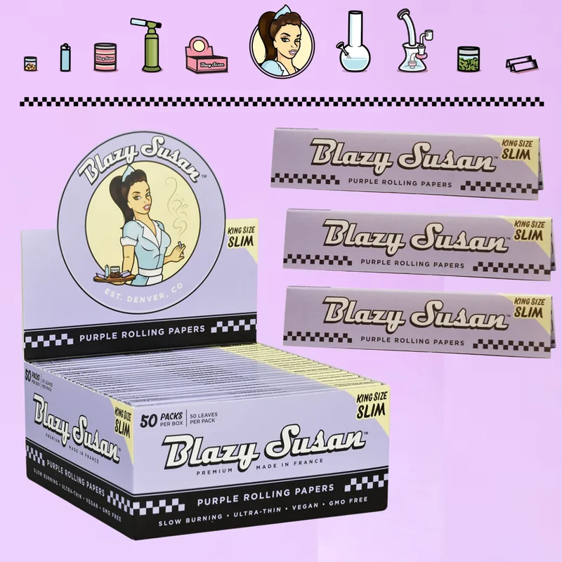 Step up your rolling game with the BLAZY SUSAN PURPLE EDITION KING SIZE SLIM ROLLING PAPERS DISPLAY OF 50 (50PK) from Blazy Susan. This rolling paper is crafted with quality materials that deliver a superior smoking experience. Slow-burning and easy to work with, it is a favorite among both casual smokers and connoisseurs. Shop bulk at Port City Wholesale.