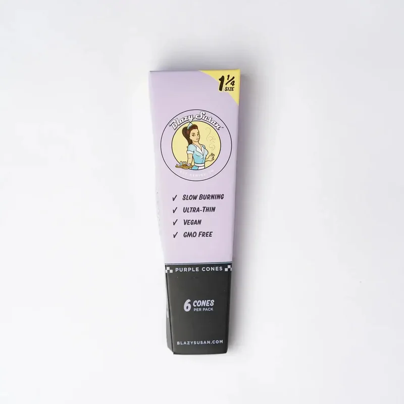 Blazy Susan Purple Pre Rolled Cones Blazy Susan Purple Pre Rolled Cones offer a premium, ready-to-fill option for retailers and smokers who want convenience, consistency, and standout style. Made from ultra-thin, slow-burning paper, these cones deliver a smooth, even burn while letting the contents shine—no harsh taste, no tobacco, no nicotine. The signature purple paper adds a bold visual upgrade to any session and makes these cones a popular choice for smoke shops, dispensaries, and wholesale buyers looking for high-turn, eye-catching rolling products. Each cone is precision-rolled for easy filling and reliable airflow. Available Sizes Shorty (53mm / 2.09”) – Holds ~0.5g, 12 cones per pack 1 1/4” (84mm / 3.31”) – Holds ~1g, 6 cones per pack King Size (109mm / 4.29”) – Holds 1.6–1.8g, 3 cones per pack Product Features 100% vegan GMO-free Nicotine-free Tobacco-free Perfect for retail displays, bulk purchasing, and customers who want premium cones with personality.