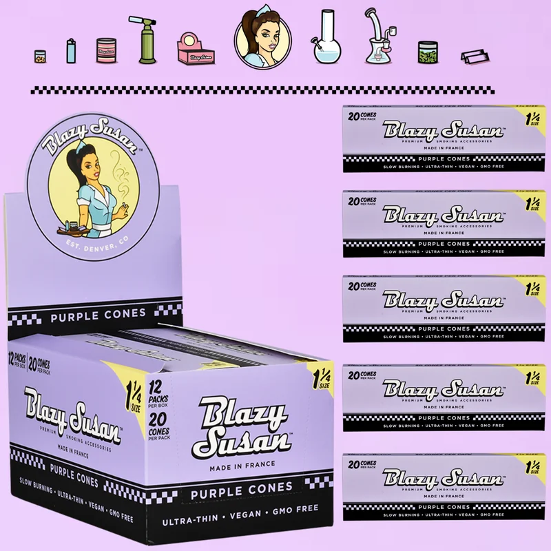 BLAZY SUSAN PURPLE PRE-ROLLED CONES 1 1/4 SIZE 20CT DISPLAY OF 12 Elevate your smoking experience with Blazy Susan Purple Pre-Rolled Cones. These vibrant 1 1/4 size cones are crafted from premium ultra-thin paper for a smooth, even burn. Perfect for those who value style and convenience, these cones are pre-rolled for easy packing, making them ideal for both new and experienced users. With 20 pre-rolled cones per pack and a display of 12, this is the perfect addition to any retail space or perso