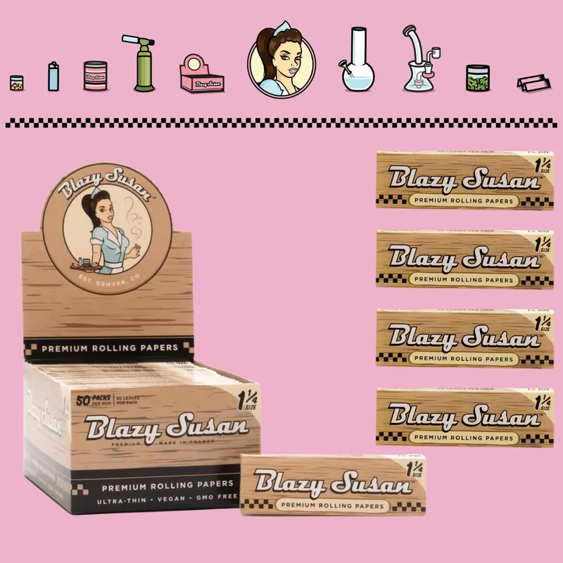 BLAZY SUSAN UNBLEACHED 1 1/4 ROLLING PAPERS DISPLAY OF 50 (50PK) — Blazy Susan's premium rolling paper designed for the discerning smoker. Crafted with quality materials for a clean taste and consistent burn rate. This 50PK package offers great value for stocking retail shelves or personal use. Available at wholesale from Port City Wholesale.