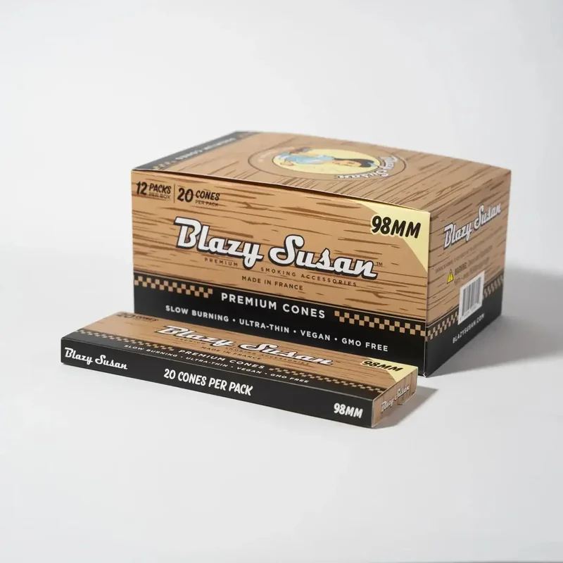 Blazy Susan Unbleached Pre-Rolled Cones 20ct – 12 Pack Blazy Susan Unbleached Pre-Rolled Cones are premium-quality cones made from ultra-thin French paper for a smooth, slow, and even burn. Designed for convenience and consistency, these cones are ideal for smoke shops, vape stores, and wholesale customers looking to stock a trusted, eco-conscious rolling solution. Crafted from ethically sourced, plant-based paper, these cones are 100% vegan, GMO-free, nicotine-free, and tobacco-free. The unbleached paper delivers a clean, natural smoking experience without added chemicals. Each 12-pack includes compact, portable boxes that are perfect for retail displays, at-home use, or on-the-go customers. Available Sizes Shorty (53mm | ~0.5g): Great for quick sessions and personal use. 1 1/4” (84mm | ~1g): A classic size with balanced burn and capacity. 98mm (1.25–1.4g): Ideal for a longer, smoother experience. King Size (109mm | 1.6–1.8g): Perfect for extended sessions and group settings. Blazy Susan cones combine style, sustainability, and performance—an easy add-on for any rolling paper lineup.