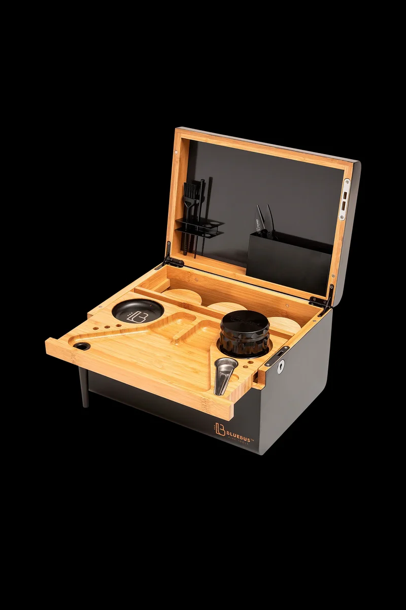 Crafted from sustainable bamboo, the Discovery Storage Box by Blue Bus Fine Tools is a perfectly designed all-in-one smoking kit/stash box . This attractive and durable box made of beautiful bamboo has everything you could possibly need (and more) to enjoy the ultimate smoking experience. The Discovery features a portable rolling tray, spacious compartments, a magnetic board built into the lid, and odor-proof jars for storing your stash. But that’s just the tip of the iceberg because you get lots more! You also get a tool stand, a 5 inch tall high-quality aluminum herb grinder, a round herb brush, a cleaning brush, two metal cones for filling cones, two cone funnels, mini scissors, a metal packing stick, 10 metal stickers, 1 metal plate, 2 smell proof bags for storage, two keys, and a wall hook. Also included are 2 silicone strips for adjusting the phone-tablet size to the tray. Whether you’re a newbie smoker or a seasoned stoner, the Discovery comes with everything you need for mess-free and hassle-free sessions. This is a high-end stash box that’s built to last. It’s the ideal gift solution for any hard-to-buy-for smoker as everyone would love owning the Discovery and that’s a fact! The Discovery measures 10.8”L x 6”H x 7.87” D. It's available in Black and Natural. The box features a built-in lock for keeping your items secure. Kit includes: Bamboo box Lid with Magnetic Board Sliding Rolling Tray 3 Smell Proof Glass Jars Tools stand 5-Inch High-Quality Aluminum Herb Grinder Round Herb Brush Cleaning Brush Metal Cone (king size for pre-rolled cone filling) Metal Cone (1 ¼ size for pre-rolled cone filling) 2 Cone Funnels (for pre-rolled cone filling) Mini Scissors Metal Packing Stick 10 Metal Stickers 1 Metal Plate 2 Silicone Strips (to adjust the phone/ tablet size to the tray) 2 Smell-Proof Bags (for herb storage) 2 Keys 1 Wall Hook
