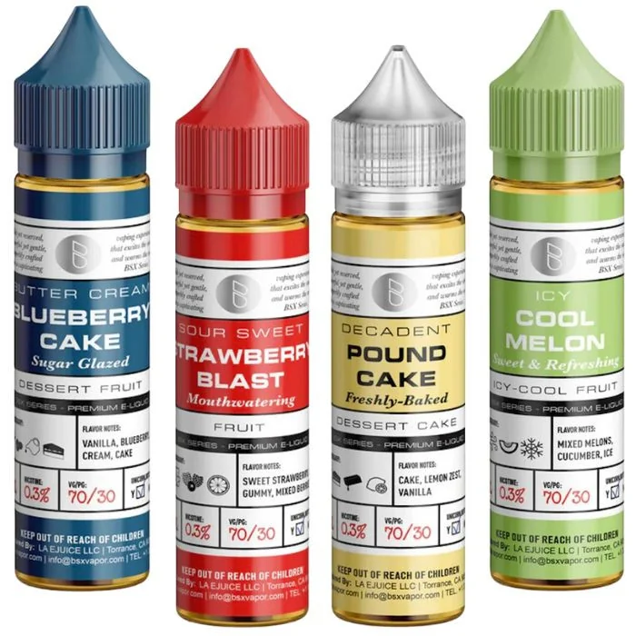 BSX Vapor E Liquid focuses on clarity, both in vapor and taste. Each 60ml bottle contains a finely tuned blend of high-quality ingredients that delivers clean, bold flavor with every puff. Designed for sub-ohm vaping, BSX offers a smooth VG/PG balance that suits daily vapers and flavor chasers alike. With a wide array of taste profiles—from fruits to desserts—it appeals to diverse preferences while maintaining consistency and quality throughout the lineup. BSX Vapor E Liquid Features: Available in 60ml bottles. Nicotine strengths: 0mg, 3mg, and 6mg. Crafted with high-quality ingredients for clean flavor. Wide variety of flavors to satisfy every palate. Ideal for sub-ohm vape setups. Balanced VG/PG blend for smooth vapor and rich taste. BSX Vapor E Liquid Flavors: Banana Cream Pie: A rich blend of creamy banana custard and pie crust. Blue Razz: A sweet and tangy fusion of blue raspberry flavors. Blueberry Cake: A deliciously sweet blueberry cake flavor with creamy notes. Butterscotch Reserve: A smooth, velvety butterscotch with a hint of tobacco. Caribbean Punch: A tropical mix of juicy fruits for a refreshing experience. Cool Melon: A cool, crisp melon flavor with a refreshing finish. Fizzy Lemonade: A zesty lemonade flavor with a fizzy, sparkling twist. Guava Ice: A chilled guava flavor with a refreshing icy exhale. Lush Ice: A blend of watermelon and cool menthol for a frosty fruit experience. Mango Tango: A vibrant mango flavor that dances on your taste buds. O.F.T.: A delightful mix of chewy, juicy fruits. PBLS: A cereal-inspired flavor with fruity notes and creamy milk undertones. Peach Ice: A sweet, juicy peach flavor with a cool menthol finish. Pound Cake: A classic buttery pound cake flavor with a touch of sweetness. Strawberry Gummy: A chewy strawberry candy flavor that's both sweet and tart. Strawberry Milk: A creamy blend of ripe strawberries and smooth milk. Strawnana Ice: A refreshing mix of strawberry and banana with a cool m