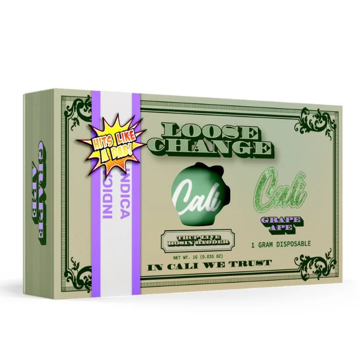 Cali Extrax Loose Change Disposable 1G offers a sophisticated vaping experience with a 1G capacity featuring THCP Live Rosin Badder. Rechargeable via USB-C, it incorporates Delta 8, Delta 8 Live Resin, and terpenes for smooth hits. Strains like Blueberry Lemon Diesel, Georgia Peach, and Grape Ape provide variety. Compliant with the 2018 Farm Bill and third-party tested for quality assurance, it's a reliable choice for vape enthusiasts. Cali Extrax Loose Change Disposable 1G Features: Compact 1G Capacity: Perfectly sized for a premium vaping session with THCP Live Rosin Badder. USB-C Rechargeable Design: Ensures your vape is always ready with fast and convenient charging. Advanced Cannabinoid Blend: Incorporates Delta 8, Delta 8 Live Resin, and carefully selected terpenes. Variety of Strains: Options like Blueberry Lemon Diesel (Sativa), Georgia Peach (Hybrid), and Grape Ape (Indica). Smooth and Flavorful Hits: THCP Live Rosin Badder delivers consistent, satisfying draws. 2018 Farm Bill Compliant: Contains less than 0.3% Delta-9 THC, adhering to legal standards. Durable Construction: Built to last, ensuring reliability throughout the vape's lifespan. 3rd Party Lab Tested: Guaranteed safety, potency, and quality with every use. Cali Extrax Loose Change Disposable 1G Ingredient List: Delta-8 THC (780mg) Delta-8 Live Resin (100mg) THCP (50mg) Terpenes Cali Extrax Loose Change Disposable 1G Flavors/Strains: White Cherry Gelato: Elevate your senses with our 1-gram White Cherry Gelato disposable, featuring an indulgent blend of flavors and deeply relaxing effects. Enjoy the sweet essence of ripe cherries and creamy gelato, with hints of earthy undertones for a tranquil experience. Grape Ape: Immerse yourself in the plush tranquility of our Grape Ape disposable, known for its soothing effects and rich grape-like sweetness, mingled with earthy tones for a serene vaping experience. London Pound Cake: Journey into decadence with London Pound Cake disposabl