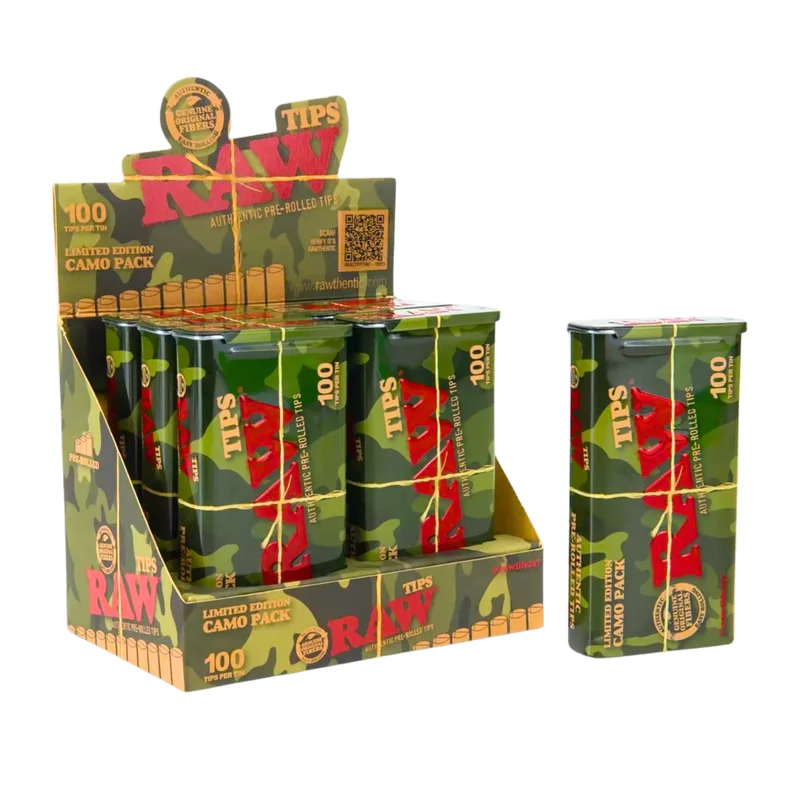 RAW CAMO EDITION PREROLLED TIPS 100CT TIN DISPLAY OF 6 (RAW-186) The RAW Camo Edition Pre-Rolled Tips offer the same RAW natural unrefined fiber quality in a limited-edition camouflage tin . With 100 pre-rolled tips per tin , these are perfect for customers who want convenience, quality, and a unique collector’s packaging. Ideal for wholesale RAW distributors , smoke shops , and retailers looking to stock high-demand, branded accessories with strong shelf appeal. Features: 100 natural pre-rolled