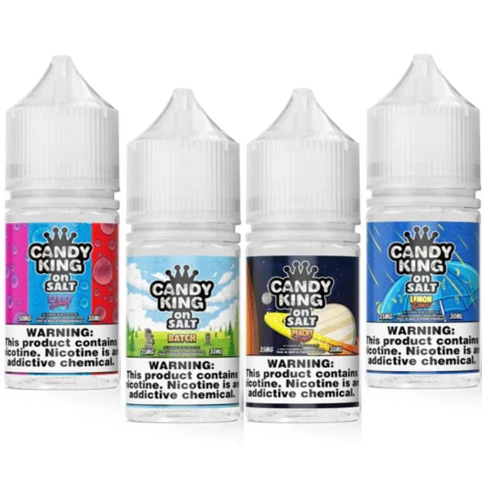 Candy King Nicotine Salts offer a smooth, satisfying hit with flavors reminiscent of classic candies. Available in 30ml bottles with 35mg and 50mg nicotine strengths, they provide a premium vaping experience. Crafted with high standards, these nicotine salts capture the essence of beloved childhood treats, ideal for vape shops seeking top-notch products. Candy King Nicotine Salts Features: Flavor Profile: Sweet and sour candy-inspired blends Nicotine Strengths: Available in 35mg and 50mg Bottle Size: 30ml Target Audience: Perfect for vape stores and smoke shops Key Flavors: Fish-Shaped Red Candy, Strawberry Rolls, Berry Dweebz, and more Manufacturing Quality: Crafted with the same high standards as Candy King E-Liquids Vaping Experience: Provides a smooth and satisfying hit with high nicotine content Nostalgia Factor: Flavors that capture the essence of beloved childhood candies Candy King Nicotine Salts Flavors: Batch: A mix of sweet and sour gummy candies with a refreshing menthol finish. Belts Strawberry: Classic strawberry candy belts offering a sweet and satisfying vape experience. Berry Dweebz: A delightful blend of assorted berry candies with a cool menthol touch for a refreshing vape. Cola Gummies: Enjoy the nostalgic taste of fizzy cola gummy candies. Gobbies: A burst of mixed fruity candy flavors for a delightful vaping experience. Gummy Bears: Chewy, fruity gummy bear flavors for a playful vape. Gush: A sweet and tangy blend of mixed fruit candies. Hard Apple: Crisp, tart apple candy flavor complemented by a cool menthol breeze. Jaws: A unique blend of fruity flavors with a refreshing twist. Lemon Drops: Tangy lemon candy with a hint of menthol for a refreshing citrusy vape. Mint: A cool and refreshing mint flavor for a crisp vape. Mystery Air Balloons: A mix of mysterious and delightful fruity flavors. Peachy Rings: Sweet and juicy peach candy rings finished with a cool menthol kick. Pink Lemonade Strips: Tangy pink lemonade candy flav