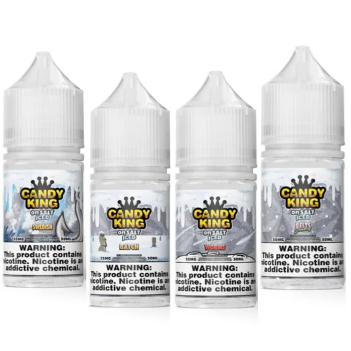 Candy King On Ice Nicotine Salts deliver a burst of fruity flavors with a cool menthol twist. Available in 35MG and 50MG nicotine strengths, these 30ml bottles are perfect for a satisfying, flavorful nicotine experience. A top choice for retailers looking for premium nicotine salts. Candy King On Ice Nicotine Salts Features: Refreshing Flavors: Offers a burst of fruit flavors with a cool menthol twist. Nicotine Strengths: Available in 35MG and 50MG options. Bottle Size: Comes in 30ml bottles, perfect for vape stores and smoke shops. Variety of Flavors: Includes tropical blends and sweet tastes made with the finest ingredients. Premium Quality: Manufactured by Dripmore, ensuring high-quality and consistency. Popular Brand: Known for amazing taste and variety, Candy King On Salt is a favorite worldwide. Versatile Use: Now available in salt nicotine, catering to a broader audience. Dripmore Collection: Part of the Dripmore family, alongside other renowned brands like Candy King, Cookie King, and Milk King. Candy King On Ice Nicotine Salts Flavors: Batch: A mix of sweet and sour gummy candies with a refreshing menthol finish. Berry Dweebz: A delightful blend of assorted berry candies with a cool menthol touch for a refreshing vape. Bubblegum: Classic bubblegum flavor with an icy menthol twist, delivering a sweet and cool vaping experience. Hard Apple: Crisp, tart apple candy flavor complemented by a cool menthol breeze. Lemon Drops: Tangy lemon candy with a hint of menthol for a refreshing citrusy vape. Peachy Rings: Sweet and juicy peach candy rings finished with a cool menthol kick. Pink Squares: Chewy pink candy squares with a refreshing menthol twist for a sweet and cool experience. Strawberry Belts: Sugary strawberry candy belts with an icy menthol finish. Strawberry Rolls: Sweet strawberry candy rolls infused with a refreshing menthol touch. Swedish: Classic Swedish candy flavor with a cool menthol breeze. Worms: A mix of sweet and sour gummy wo