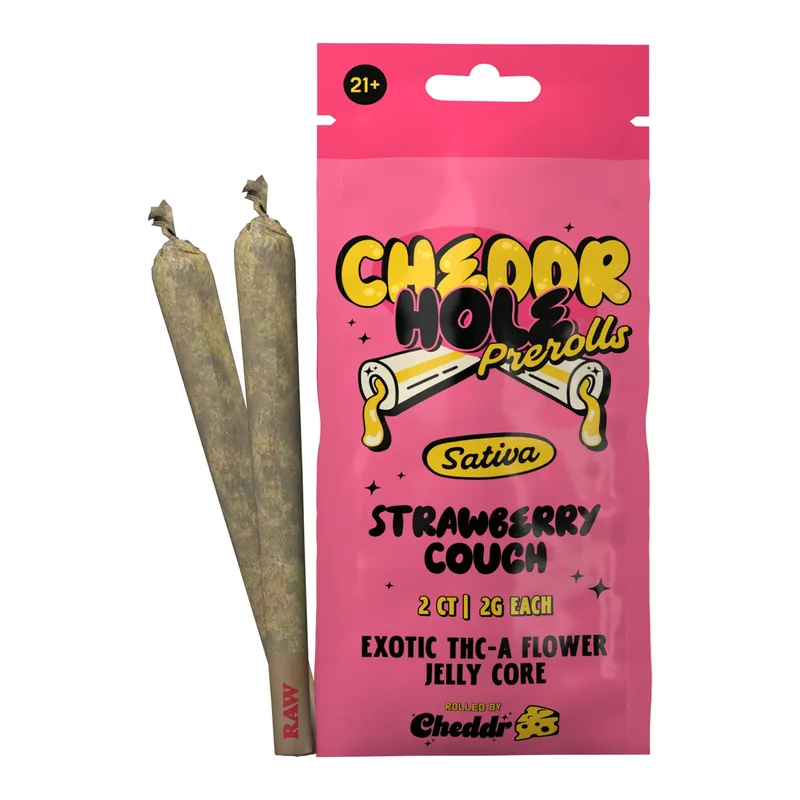 Cheddr Holes — 2g Jelly-Core Hash Holes (2-Pack) Meet Cheddr Holes , our newest heavy-hitting infused prerolls crafted for true connoisseurs. Each pack comes with two 2-gram hash holes , built with 1.5g of premium flower wrapped around a 0.5g jelly-core concentrate center for an ultra-smooth, long-burning, flavor-packed session. The jelly core melts evenly from the inside out, delivering a potent, terpene-rich hit from start to finish — no canoeing, no harshness, just pure infused perfection. Available in 5 Bold Strains: 🧀 Blue Cheese – Funky, creamy, savory 🍨 Gelato – Sweet, dessert-like, balanced 🍓 Strawberry Cough – Bright, fruity, uplifting ⚡ Green Crack – Energizing, zesty, sharp 🍪 Biscotti – Smooth, earthy, cookie-like Why You’ll Love Cheddr Holes: 2g each • 2-pack per order Jelly core of premium concentrate for heavy potency 1.5g flower + 0.5g concentrate blend Slow-burning, even, ultra-smooth pull Packed with flavor + serious punch Perfect for holiday sessions, sharing with the homies, or treating yourself to a top-shelf infused preroll that actually hits the way it should. Disclaimer: Our hemp-derived products contain less than 0.3% Δ9-THC on a dry weight basis in compliance with the 2018 Farm Bill. State and local laws may vary. Please verify the laws for your region before purchase. Available where permitted by law. To maintain compliance with state specific regulations, this product does not currently ship to the following US states: Alabama, Alaska, Arizona, Arkansas, California, Colorado, Connecticut, Florida, Georgia, Hawaii, Idaho, Indiana, Iowa, Kansas, Kentucky, Louisiana, Maryland, Massachusetts, Michigan, Minnesota, Mississippi, Montana, Nebraska, Nevada, New Hampshire, New Mexico, New York, North Dakota, Ohio, Oklahoma, Oregon, Rhode Island, South Dakota, Tennessee, Texas, Utah, Vermont, Virginia, Washington, West Virginia, Wyoming, AFE, AFP, American Samoa, Guam, Marshall Islands, Micronesia, Northern Mariana Islands, Palau, Puerto Rico, US ...