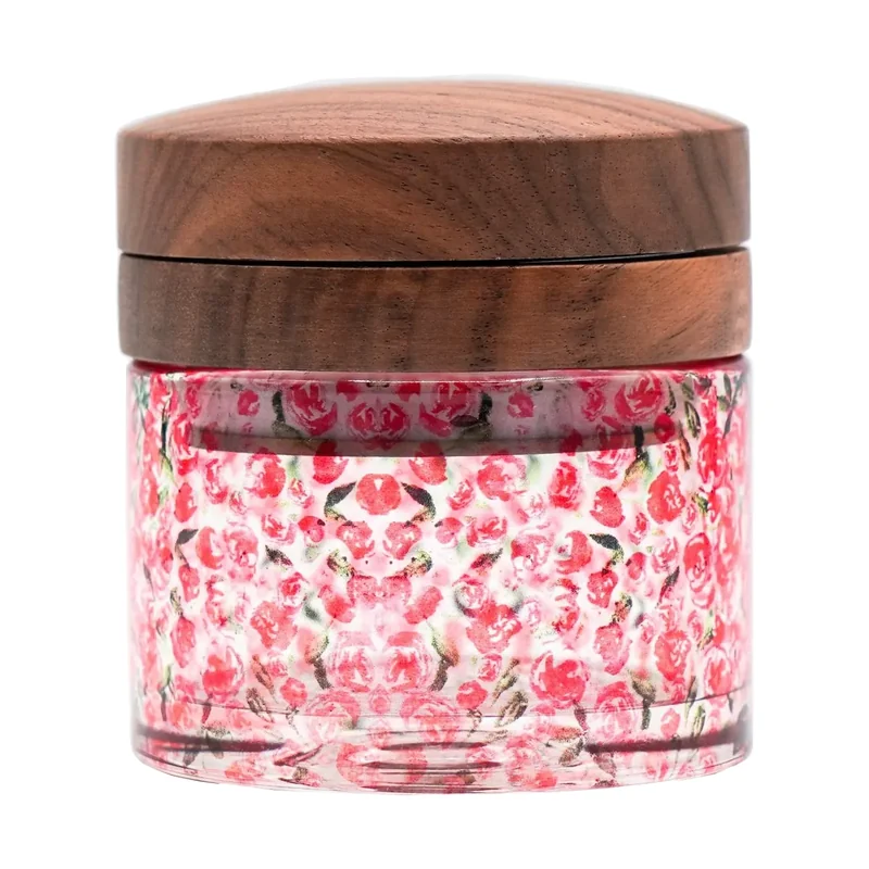Cirrus Glass Grinder, thoughtfully engineered for the everyday smoker. Milled aluminum teeth, sculpted walnut core, and a borosilicate base in perfect harmony. Our Rosa design gives an elegant floral feel, hand-crafted for the perfect grind. - - - PRODUCT FEATURES: Borosilicate glass 6mm thickness Black walnut lid with natural grain Magnetic & silicone closure Aluminum teeth for smooth grind 2.5inch diameter