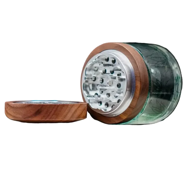 Cirrus Glass Grinder, thoughtfully engineered for the everyday smoker. Milled aluminum teeth, sculpted walnut core, and a borosilicate base in perfect harmony. Our classic Sativa design adds a touch of botanical elegance to this sought after piece. Hand-crafted for the perfect grind. - - - PRODUCT FEATURES: Borosilicate glass 6mm thickness Black walnut lid with natural grain Magnetic closure Aluminum teeth for smooth grind 2.5inch diameter