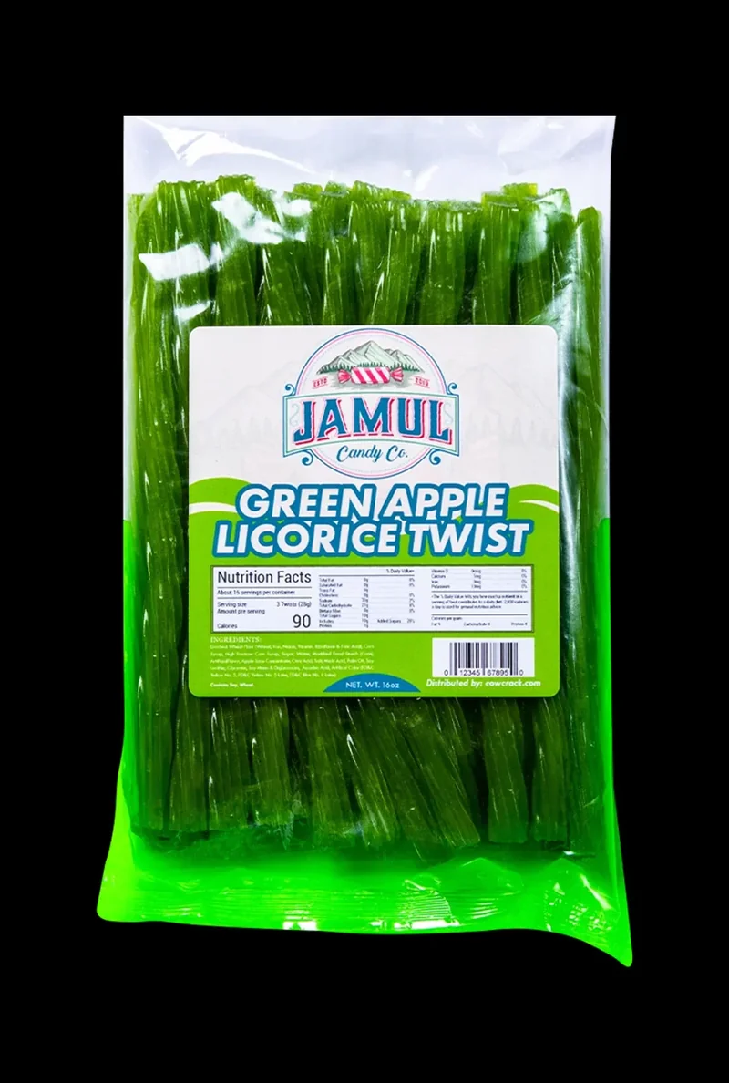 The Jamul Candy Co. Green Apple Licorice - 16 oz. is a premium confectionery product expertly crafted with extruded and flavored licorice, boasting a vibrant green apple flavor profile, all presented in a substantial 16-ounce package by Jamul Candy Co. Uncompromising Green Apple Flavor Experience the unmistakable essence of green apple in every bite of this exceptional licorice, where a perfectly balanced blend of sweet and tangy notes will leave you craving more. The bold, bright flavor is skillfully infused into each piece, ensuring a consistently satisfying taste experience. Chew-Worthy Texture Say goodbye to sticky, messy licorice. Jamul Candy Co.'s Green Apple Licorice boasts a masterfully achieved texture that is both chewy and indulgent, without sacrificing a hint of firmness. Each piece is carefully crafted to provide a pleasurable chewing experience that will keep you coming back. The Ultimate Indulgence Whether you're a licorice connoisseur or simply seeking a reliable treat, the Jamul Candy Co. Green Apple Licorice - 16 oz. is the perfect companion. With its uncompromising flavor and texture, this 16-ounce package is ideal for stashing, sharing, or simply savoring on your own. Grab a package today and discover a reliably delicious indulgence that will satisfy your cravings!