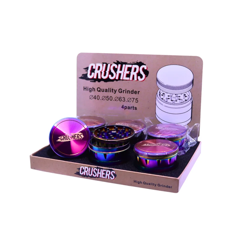 Brighten your grinding experience with the Crushers Premium 4 Parts 44mm Grinder , featuring a stunning Rainbow design . This compact grinder is crafted with a 4-part construction , including grinding chambers, a pollen catcher, and a storage compartment for smooth and efficient operation. Its 44mm size makes it portable and perfect for everyday use. Packaged in a display of 6 , this grinder is an excellent choice for retailers seeking vibrant and high-quality products. Features: 44mm Size: Comp