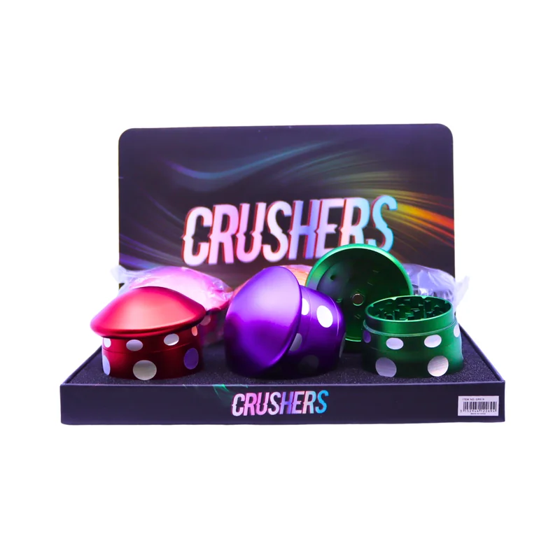 CRUSHERS PREMIUM 4 PARTS GRINDER MUSHROOM DESIGN DISPLAY OF 6 (GR519) Add a whimsical touch to your grinding sessions with the Crushers Premium LED 4 Parts Grinder Mushroom Design . Featuring a charming mushroom-inspired design , this grinder combines functionality with fun. The 4-part construction includes grinding chambers, a pollen catcher, and a storage compartment for efficient and convenient use. The built-in LED lighting enhances visibility and adds a stylish flair. Perfect for retailers,