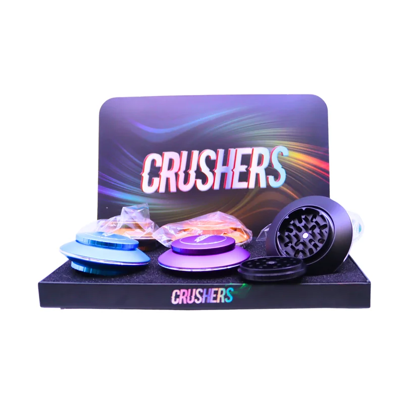 CRUSHERS PREMIUM 4 PARTS GRINDER SPACESHIP DESIGN DISPLAY OF 6 (GR522/GR1503) Take your grinding sessions out of this world with the Crushers Premium LED 4 Parts Grinder Spaceship Design . Featuring a unique spaceship-inspired design , this grinder offers both functionality and style. The 4-part construction includes grinding chambers, a pollen catcher, and storage, ensuring smooth and efficient performance. The built-in LED lighting adds a futuristic touch while enhancing visibility. The displa