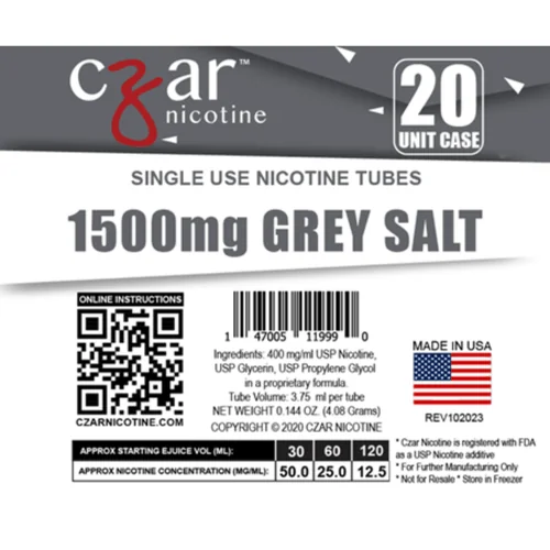 Gray Salt Czar Nicotine Single Serve Tubes 1500MG (Pack of 20) by Czar Nicotine. Well-made, functional, and priced to move. A solid addition to any smoke shop's product lineup. Size: 1500mg. Suggested retail: $139.99.
