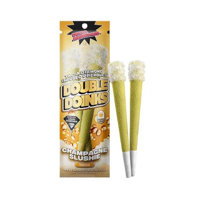 Delta Munchies Double Doinks THC-A Pre Roll features 1.5g of premium hemp flower infused with over 1g of 97.2% THC-A diamonds. Each pack includes two pre-rolls, providing a smooth, potent smoke with flavorful strains like Glazed Donut and Strawberry Jam. Ideal for retailers, this product delivers high potency and a luxurious smoking experience. Delta Munchies Double Doinks THC-A Pre Roll 1.5G Features: Premium Hemp Flower: Each pre-roll contains 1.5+ grams of high-quality hemp flower. Infused with THC-A Diamonds: Over 1 gram of 97.2% THC-A diamonds per pack for enhanced potency. Flavor Options: Choose from strains like Glazed Donut, Strawberry Jam, and Peach Cobbler. Spray-Free and Glazed: Made without sprays and glazed with liquid diamonds for a smooth, luxurious smoke. Pack Details: Each pack includes two 1.5+ gram pre-rolls, totaling 2+ grams of flower and 1+ grams of THC-A diamonds. Delta Munchies Double Doinks Flavors/Strain: Berry Marmalade (Sativa): A vibrant blend of sweet and tangy berries with a hint of citrus. This strain offers an energizing and uplifting experience, perfect for daytime use. Champagne Slushie (Indica): Features a rich, fruity flavor with notes of champagne and a refreshing slushie twist. Ideal for relaxation and unwinding after a long day. Glazed Donut (Hybrid): Combines the sweet, sugary taste of freshly baked donuts with a smooth, doughy undertone. This hybrid delivers a balanced effect, suitable for various occasions. Lemon Cherry Gelato (Hybrid): A delightful mix of zesty lemon and sweet cherry with creamy gelato undertones. This hybrid provides a balanced high with a sweet, tangy flavor. Peach Cobbler (Hybrid): Bursts with the flavor of ripe peaches and a buttery, cobbler-like sweetness. This strain is great for relaxation and enjoying a comforting, dessert-like taste. Strawberry Jam (Sativa): Features a fresh, fruity strawberry flavor reminiscent of homemade jam. This sativa strain offers a lively, uplifting