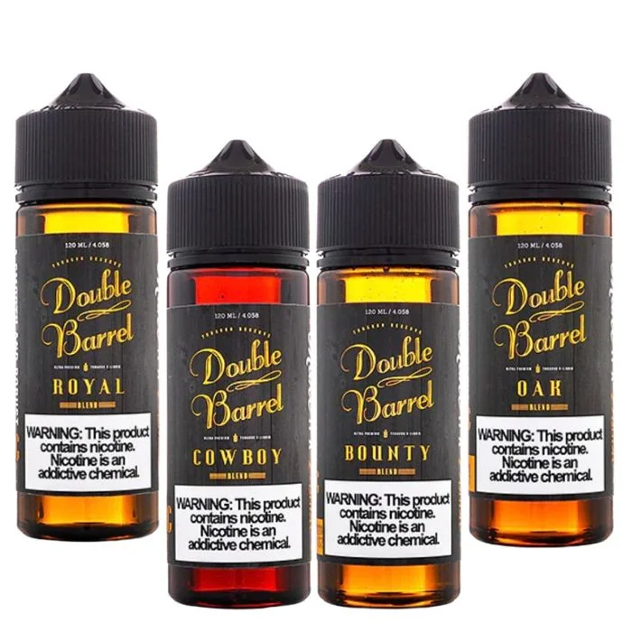 The Double Barrel Tobacco Reserve E Liquid is the result of months of refinement, ensuring an authentic tobacco taste. Made with premium USA-sourced ingredients, it provides a smooth and satisfying experience. Available in multiple nicotine strengths (0MG, 3MG, 6MG, 9MG, 12MG, and 18MG) and bottle sizes (60ML and 120ML), this e-liquid caters to a variety of vaping preferences. Double Barrel Tobacco Reserve E Liquid Features: Expertly Crafted: Months of refinement ensure authentic tobacco flavors. Premium USA-Sourced Ingredients: High-quality, true-to-flavor blends. Varied Nicotine Strengths: Available in 0MG, 3MG, 6MG, 9MG, 12MG, and 18MG. Multiple Bottle Sizes: Choose between 60ML and 120ML for your needs. Acclaimed Selection: The Bounty flavor is highly rated as a satisfying alternative to traditional cigarettes. Double Barrel Tobacco Reserve E Liquid Flavors: Bounty: Smooth and aromatic blend. It starts with sun-cured Virginia tobacco leaves, enhanced with hints of banana and cinnamon, delivering a remarkable and satisfying exhale. Burley: Blend of Kentucky tobacco, enriched with bold hints of vanilla. The robust flavor of the tobacco is perfectly complemented by the sweet, creamy undertones of vanilla, creating a rich and satisfying vaping experience. Cowboy: Smooth, full-bodied tobacco blend that mimics the experience of smoking a traditional cigarette. Made from pure American tobacco grown in Virginia, it is dried and cured to preserve its natural flavors without any added notes Oak: Rich tobacco blend featuring subtle complementary notes. Starting with hand-selected RY4 tobacco, it is expertly dried and cured. The premium tobacco is enhanced with hints of caramel, vanilla, and hazelnut, delivering a delicately delicious exhale every time. Royal: Exceptional blend featuring six different tobacco leaves for a multi-layered flavor profile. Smooth and satisfying, it offers subtle sweet undertones natural to the tobacco plant, delivering a uniquely fl