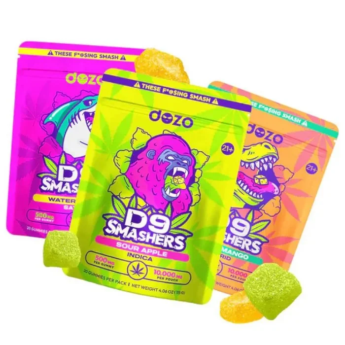 Experience next-level flavor and potency with Dozo D9 Smashers Gummies. Each 5-pack contains 10 gummies per pack, delivering a powerful 500mg of Delta-9 THC per gummy—a total of 5,000mg per pack. These bold, hemp-derived edibles are perfect for seasoned users seeking a strong, flavorful experience. Crafted for taste and potency, these gummies come in a variety of sweet, sour, and exotic profiles, making every bite an adventure. Ideal for adult consumers who enjoy high-strength edibles with rich, fruit-inspired flavors. Flavor List: Blackberry Blast – Deep berry flavor with a bold, juicy punch. Blue Razz – Sweet and tangy blue raspberry goodness. Cherry Poppers – Classic cherry with a candy-like finish. Mango Chilli – Tropical mango with a spicy twist. Peach Mango – Smooth peach meets rich, ripe mango. Pineapple Express – Tropical pineapple with energizing vibes. Purple Drank – Grape-inspired sweetness with syrupy depth. Sour Apple – Tart green apple with a sour sugar kick. Strawberry Kush Cake – Sweet strawberry layered with creamy cake notes. Tropical Punch – Fruity island blend with bold citrus. Tutti Frutti – A medley of mixed fruits in every bite. Watermelon – Classic summertime sweetness. Zaza Berries – A mysterious berry blend with loud flavor. Dozo D9 Smashers are high-potency, flavor-packed gummies built for adult enjoyment.