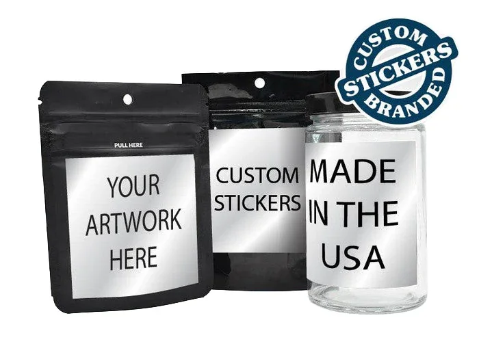 Custom Printed Packaging Stickers MADE AND PRINTED IN AMERICA GET YOUR CUSTOM LABELS IN 3 EASY STEPS! Upload your graphics to this product Choose Your Quantity Custom Printed Stickers only DOES NOT INCLUDE ANY BAGS OR POP TOPS You can have your logos, strain info, message, and images custom printed in a variety of shapes and sizes to fit many different products! 3x3 Custom Stickers for Mylar Bags and 60 Dram Pop Top Vial Our custom printed stickers are very durable. They are high quality stickers made of High Gloss White Polypropylene (BOPP). Stickers are Custom Printed and Shipped from Metro Detroit Michigan! 3" x 3" (1/8 Oz or Gram Mylar Bag)