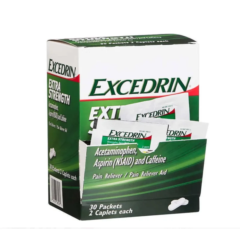 EXCEDRIN EXTRA STRENGTH 250MG ACETAMINOPHEN 2 CAPLET DISPLAY OF 30 Relieve headaches and pain fast with EXCEDRIN EXTRA STRENGTH 250MG ACETAMINOPHEN 2 CAPLET DISPLAY OF 30. These extra strength caplets combine 250mg of acetaminophen with other active ingredients to deliver powerful relief from headaches, migraines, and other minor aches and pains. Each packet contains 2 caplets, making it convenient to carry and use whenever you need quick pain relief. This display includes 30 packets, making it