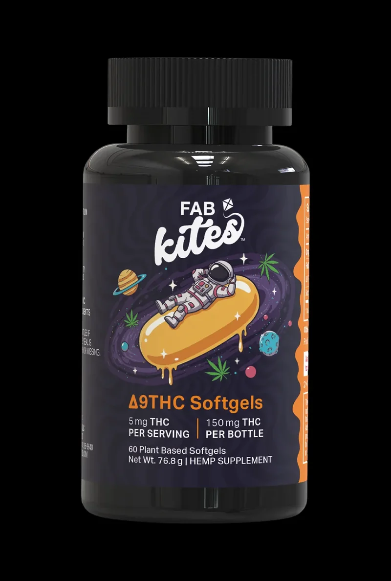 FAB Kites D9 THC Softgels deliver 5mg of Full-Spectrum Delta-9 THC per serving in a clean, vegan capsule designed to support rest, recovery, and a balanced mindset. Each softgel provides a precise, consistent dose with cannabinoids and terpenes working together for holistic support, all without animal products, artificial colors, or flavors. Disclaimer: Our hemp-derived products contain less than 0.3% Δ9-THC on a dry weight basis in compliance with the 2018 Farm Bill. State and local laws may vary. Please verify the laws for your region before purchase. Available where permitted by law. To maintain compliance with state specific regulations, this product does not currently ship to the following US states: Alabama, Alaska, Arkansas, California, Colorado, Connecticut, Georgia, Hawaii, Idaho, Iowa, Kentucky, Louisiana, Maine, Maryland, Massachusetts, Michigan, Minnesota, Mississippi, Montana, Nevada, New Hampshire, New York, North Dakota, Oregon, Pennsylvania, Rhode Island, Utah, Vermont, Virginia, Washington, West Virginia, Wyoming, AFE, AFP, American Samoa, Guam, Marshall Islands, Micronesia, Northern Mariana Islands, Palau, Puerto Rico, US Virgin Islands