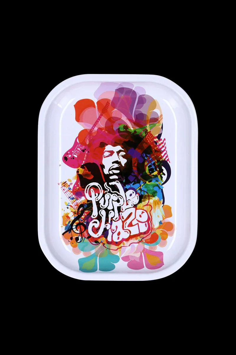 Pay homage to the late great Jimi Hendrix with the Jimi Rainbow Haze Rolling Tray . It's part of the Rock Legends collection from Famous Brandz. The tray is made of durable aluminum and has rounded edges and high sides to keep your things contained. It also has a smooth, non-stick surface for hassle-free rolling. This highly collectible tray is fun to use and easy to clean. You'll love the Jimi Rainbow Haze Graphics and so will your friends! The tray comes in your choice of two sizes: Small (7" x 5") and Medium (10.6" x 6.3").
