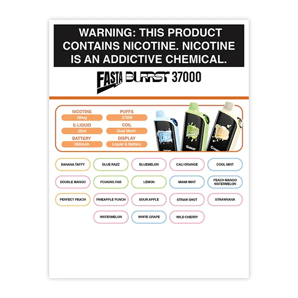MARKETING MATERIALS Showcase the full range of flavors for the FASTA BURRST 37K disposable vape collection with this laminated flavor menu . Designed for durability and visual appeal, this menu highlights the many features of this high-quality and popular product. The 8.5" x 11" laminated design ensures the menu withstands daily use in vape shops , smoke shops and convenience stores. It will help your customers easily explore the variety of available flavors. Perfect for in-store displays, this flavor menu adds a professional touch to your vape section. Key Features: Dimensions: 8.5" x 11" Laminated for durability and long-lasting use Features FASTA BURRST 37K Displays a full list of flavors for customer convenience Limit: 5 menus per store View more Marketing Materials for all brands here