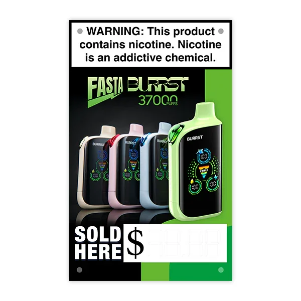 FASTA BURRST 37K Banner Vinyl Banner - 15"x24" - Durable Indoor & Outdoor Marketing Display Boost your store’s visibility with this high-quality FASTA BURRST 37K vinyl banner . Measuring 15 inches by 24 inches , this banner is designed for maximum impact in both indoor and outdoor settings . Draw attention to the best flavor disposable vape. Featuring 4 pre-installed grommet holes , it’s easy to hang in multiple locations like windows, walls, or outdoor displays. The durable vinyl material ensures long-lasting use, even in challenging weather conditions. Ideal for vape shops and retail environments . Limit of 2 banners per order . Key Features: Dimensions: 15" x 24" Durable vinyl material for indoor and outdoor use 4 grommet holes for versatile hanging options Weather-resistant design for longevity Perfect for vape stores, retail stores, smoke shops and promotional displays Mi-Pod is your number one source for wholesale vapes , hardware, and alternative products. View more Marketing Materials