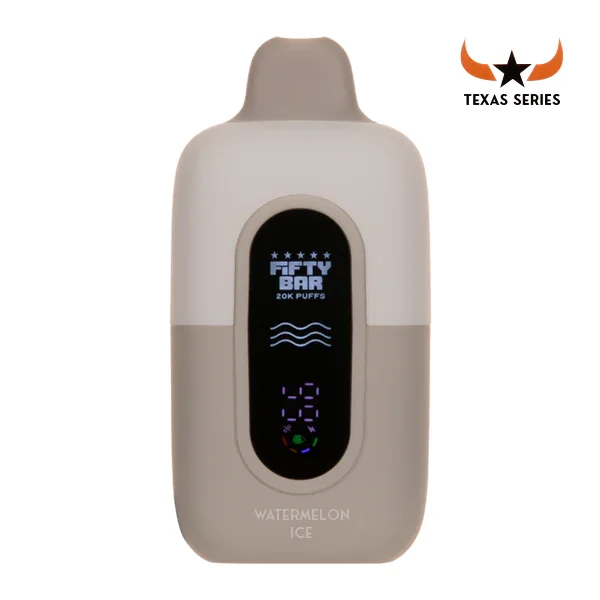 FIFTY BAR TEXAS SERIES DISPOSABLE VAPE 5-PACK Flavor : The Texas Series Watermelon Ice Fifty Bar 20K is filled and manufactured in the USA by American master formulators and features big time flavor and satisfaction. E-liquid contents : 18ml Nicotine Level : 50mg Puffs per Device : 20000 Battery : 800mAh Grade A Battery (Rechargeable via USB-C) Master Case Qty : 200 Dual Parallel Mesh Coil Built in the USA Shop All Fifty Bar Disposable Vapes Browse more disposable vape flavors