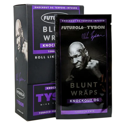 The Tyson 2.0® X Futurola - Knockout OG Terpene Infused Tobacco-Free Blunt Wrap (1ct) - Display of 25 offers premium pre-rolled convenience. Comes in a quantity of display of 25. 1-count package for maximum value. Suggested retail price $4.00. A consistent seller in any smoke shop's pre-roll section. Available at wholesale pricing from Port City Wholesale.
