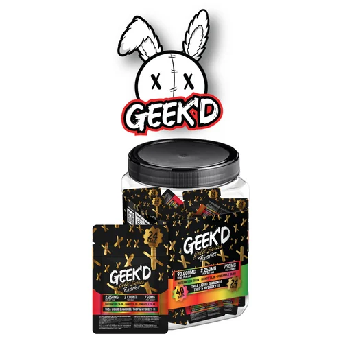 The Geek'd Extracts - 24K Gold Series Gummies 750mg 3ct (Jar of 40) offers a delicious and convenient edible experience. Comes in a quantity of jar of 40. Suggested retail price $12.00. Ships directly from manufacturer. Edibles are a top-growing category — keep your shelves stocked. Available at wholesale pricing from Port City Wholesale.