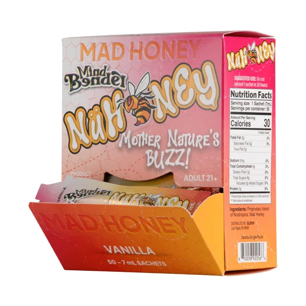 MAD HONEY EDIBLE The Vanilla NuHoney uses a blend of Nootropics, Mad Honey and flavorings to provide a psychedelic experience. Mad Honey is an all-natural psychedelic honey from Nepal. NuHoney is sold in 7mL liquid NuHoney tubes. Do not exceed 1 stick pack in 24 hours. Must be 21 years of age to purchase. 50 NuHoney 7mL tubes per display case