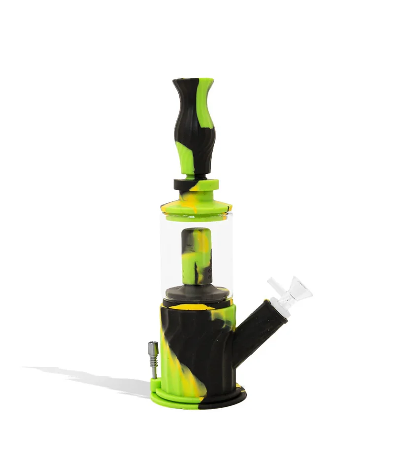 Multifunctional Silicone The Silicone 4-in-1 Waterpipe, with its versatility as a rig, nectar straw, bubbler, and waterpipe, offers users many ways to enjoy their vapor. It is a percolator water pipe with a glass section and a Swiss-style perc. It is 9 inches and boasts a 4-inch wide base and a 14mm ground joint. Users can easily transform it into a dab rig by removing the middle section or switching out the bowl, downstem, and mouthpiece to create a bubbler. The mouthpiece is interchangeable, allowing you to replace it with a titanium nail or bowl, turning it into a chillum or nectar collector. Crafted to elevate your vaping pleasure, this collection offers a variety of efficient devices and tools for your every session. What’s Included: (1) Mouthpiece (1) Bubbler Base (1) Percolation Chamber (1) Downstem Adapter (1) Downstem (1) Funnel Bowl