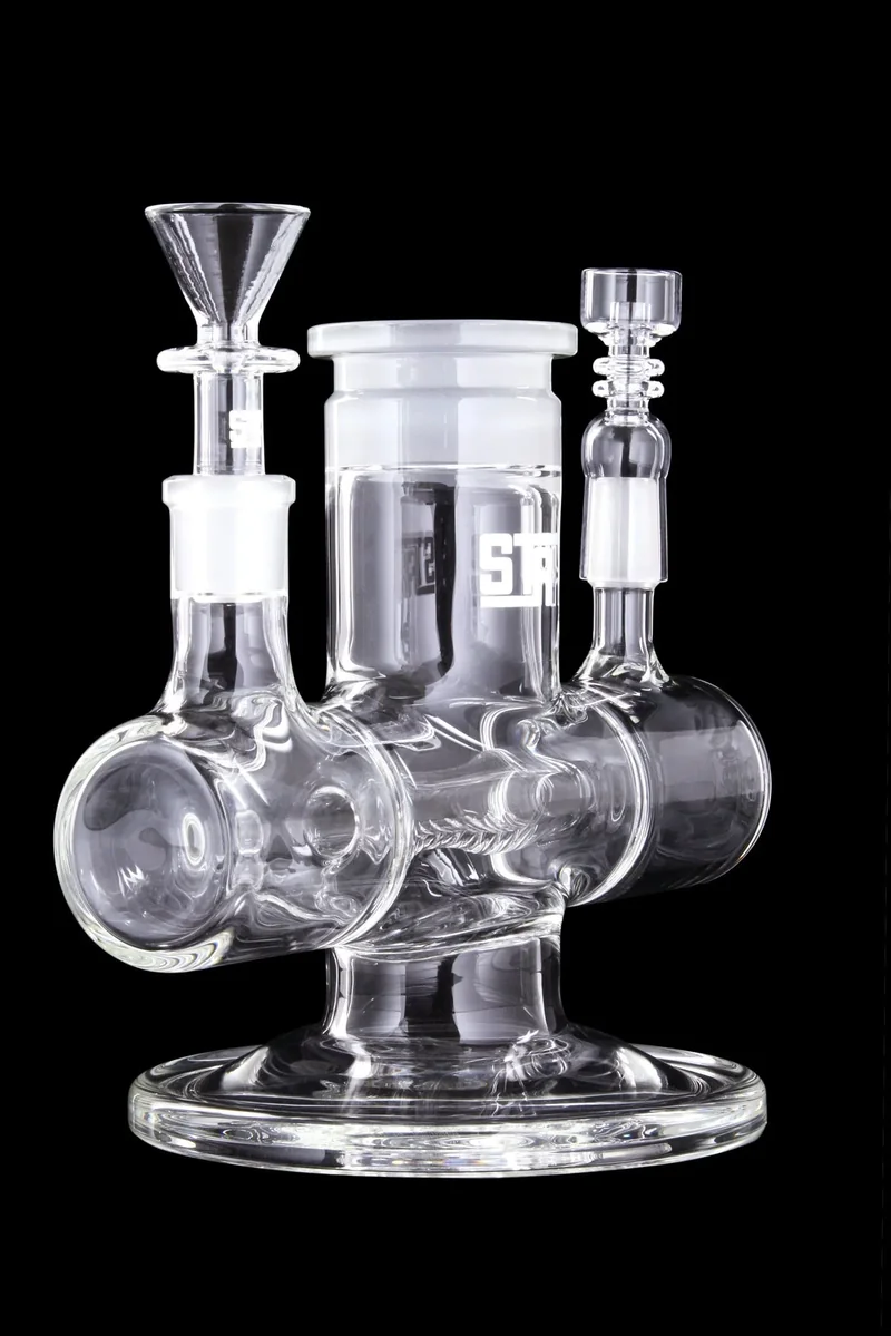 Extracts or flower? How about both!  The STAX collection from Grav Labs is the first modular water pipe series available on the market. That means you can tailor your pipe yourself, for a personal fit. Add percolation, dial in airflow, and build your bong as tall as you want. All with the same quality glass you expect from Grav Labs. This base is designed to give you the option of switching between extracts or flower, without breaking out a second rig. Featuring an inline perc for smoke diffusion and two 14.5mm ground joints, one male and one female with a matching flower bowl and quartz nail. Also included with the base is a 14.5mm joint stopper, one plastic keck clip, and one metal keck clip.