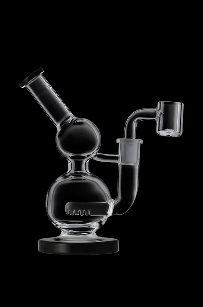 The 5.2-inch tall Mini Round Dab Rig by Groove is a handsome little chugger that's been constructed using 3-4mm thick, high-quality glass, giving it all the durability needed for daily use. This micro concentrate rig uses an inline percolator to break up and filter the smoke as it travels upward through the two round smoke chambers. This percolation power ensures smoothness with every hit you take from the rimmed mouthpiece on top of the angled neck. This is a robust, smooth-hitting little rig featuring a fixed reinforced downstem. It comes complete with a male quartz banger that’s positioned at a 90 degree joint angle. And talk about style! This clear glass rig looks super nice with the matching black accents on the thick round base, the perc and mouthpiece. This rig is ideal for anyone looking for a compact, durable, and stylish way to enjoy their favorite cannabis concentrates.