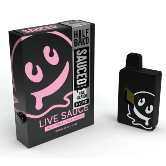 Half Bak'd Live Resin Sauced Disposable 4G offers an exclusive THC-A live resin formula with custom sauce terpenes. Its sleek design and USB-C charging make it convenient for on-the-go indulgence, delivering a clean, flavorful vaping experience. Half Bak'd Live Resin Sauced Disposable 4G Features: 4-Gram device. Exclusive THC-A live resin formulation. Pre-heat button. Autodraw technology. Custom designed sauce terpenes. Half Bak'd Live Resin Sauced Disposable 4G Flavors: Sour Sangria - Sativa: Sour Sangria is a vibrant and uplifting sativa strain, known for its invigorating citrus notes and tangy, sweet aftertaste. Perfect for daytime use, it provides an energetic and focused high, making it ideal for creative pursuits and social activities. Pink Picasso - Hybrid: Pink Picasso is a balanced hybrid that offers the best of both worlds. With its sweet and floral aroma, this strain delivers a harmonious blend of euphoria and relaxation. It's perfect for unwinding after a long day or enjoying a calm evening. Raspberry Cough - Sativa: Raspberry Cough is a sativa-dominant strain with a delightful berry flavor and a hint of spice. This strain is known for its clear-headed and uplifting effects, making it great for enhancing focus and creativity without the usual sativa-induced anxiety. Holy Moly - Hybrid: Holy Moly is a versatile hybrid that provides a balanced high, combining the relaxing effects of an indica with the cerebral stimulation of a sativa. It has a unique earthy and spicy flavor profile, perfect for those seeking both mental and physical relief. Ube Cream - Indica: Ube Cream is a rich and creamy indica strain, reminiscent of the popular Filipino dessert. This strain offers deep relaxation and a sense of tranquility, making it an excellent choice for nighttime use or for unwinding after a stressful day. Kiwi Jam - Indica: Kiwi Jam is a sweet and fruity indica strain with a smooth, jam-like flavor. Known for its potent relaxing effects, this strain