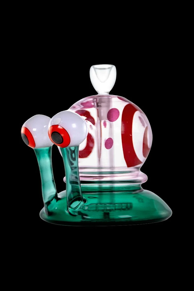 You thought the jellyfish bong was epic?! Look at what we have available now!! We now proudly present our next water themed bong to our store! The Snail XL bong was i nspired by our love for Snails who live under the sea. Carefully handcrafted to create a beautiful working glass bong. This cute snail features 2 large eyeballs with orange eye decals and has a large shell pattern decal. SPECS Height: 6" Tall Base: 6" Wide Large Showerhead Percolator Recessed Joint WHATS INCLUDED (1) Hemper Snail XL Bong (1) 14.5mm male flower bowl