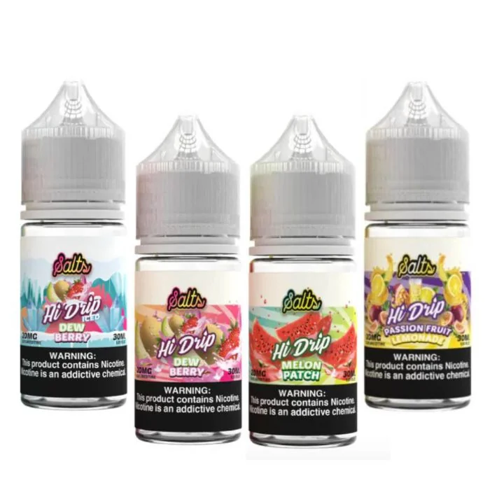 Hi-Drip Nicotine Salts offer a satisfying vaping experience, with two nicotine strength options – 20mg or 50mg – allowing you to customize your vape to match your preferences. With a balanced 50/50 VG to PG ratio, Hi-Drip Salts deliver rich flavors and dense vapor, ensuring a smooth and flavorful hit every time. But Hi-Drip is just the beginning; at Vape Royalty, our extensive collection of e-juices has something for everyone. Whether you're into classic tobacco, refreshing fruits, indulgent desserts, or fun candy flavors, we’ve got the perfect e-liquid to satisfy your cravings. Flavor Descriptions: Butter Mints: A smooth and creamy blend of sweet butter and refreshing mint, reminiscent of classic after-dinner mints. Caramel Pear: Juicy, ripe pear drizzled with rich, golden caramel, creating a perfectly balanced sweet and fruity experience. Dew Berry Iced: A crisp mix of honeydew melon and sweet berries, enhanced with a cool menthol finish for a refreshing vape. Dew Berry: A delightful combination of honeydew melon and succulent berries, offering a smooth and sweet flavor. Guava Lava Iced: Exotic guava blended with a mix of tropical fruits, cooled down with a refreshing burst of menthol. Guava Lava: A vibrant medley of tropical guava and other luscious fruits, delivering a juicy and exotic taste. Island Orange Iced: Zesty orange paired with a hint of tropical island fruits, finished with a refreshing menthol breeze. Island Orange: A bright and tangy orange flavor infused with a subtle blend of tropical fruits for a refreshing citrus burst. Mango Lemonade Iced: Tangy lemonade infused with sweet, ripe mango, topped with a cool menthol twist for a refreshing treat. Mango Lemonade: A tropical fusion of juicy mango and zesty lemonade, perfectly balanced for a refreshing and sweet vape. Melon Patch Iced: A juicy trio of melons, perfectly chilled with a hint of menthol for a crisp and refreshing experience. Melon Patch: A mouthwate