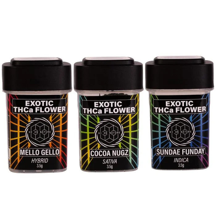 Sourced from California’s best growers, Hi On Nature Exotic THCA Flower 3.5G offers rich flavors and powerful THC-A effects. Perfect for relaxing and enhancing social experiences, this premium flower delivers a smooth, enjoyable high. Hi On Nature Exotic THCA Flower 3.5G Features: Generous 3.5g Package: Ideal size for personal use or sharing. Rich Flavors: Showcases the natural, full-bodied flavor profile of THC-A. Potent Effects: Delivers powerful and smooth effects for relaxation and mood elevation. Premium Quality: Carefully selected flower for a superior cannabis experience. Versatile Use: Perfect for both unwinding after a long day or enhancing social moments. Hi On Nature Exotic THCA Flower Flavors/Strain: Cocoa Nugz - Sativa: A vibrant, energizing sativa strain with a sweet cocoa aroma, offering uplifting effects that help boost focus and creativity. Mello Gello - Hybrid: A well-balanced hybrid with a fruity and citrusy profile, delivering a relaxed and euphoric high perfect for unwinding after a long day. Sundae Funday - Indica: A sweet, dessert-inspired indica strain with creamy and fruity notes, providing deep relaxation and calming effects to wind down.